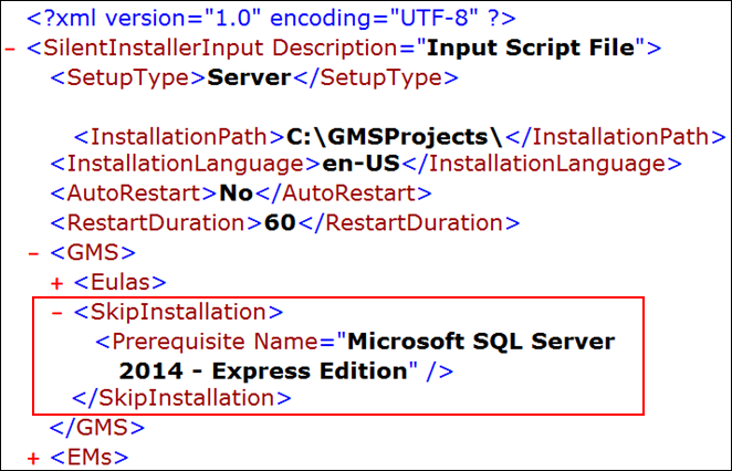 For example, you want to enable the SkipInstallation section, and skip the installation of a prerequisite Microsoft SQL Server 2014 – Express Edition. You would delete the XML comments before and after the entry, as shown below.