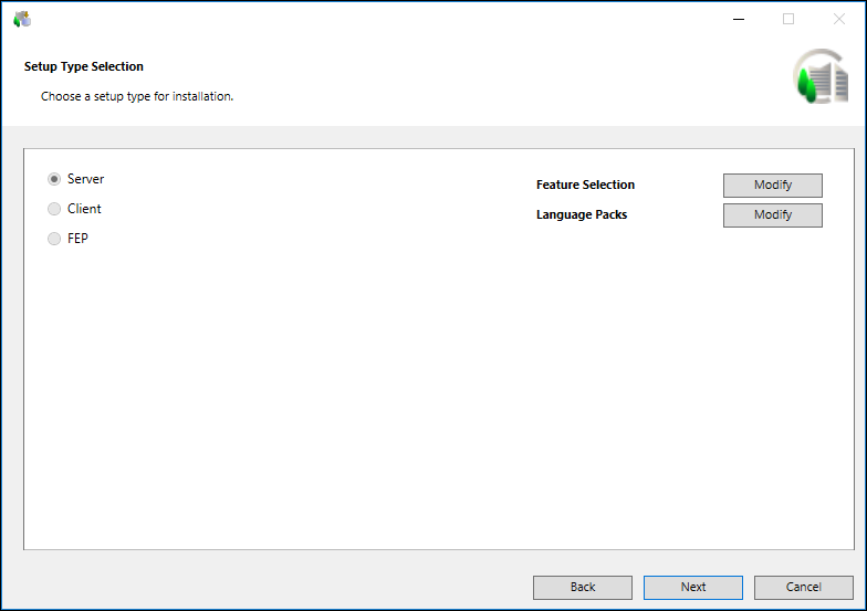 - In the Language Packs dialog box, click OK to return to the Setup Type Selection dialog box.