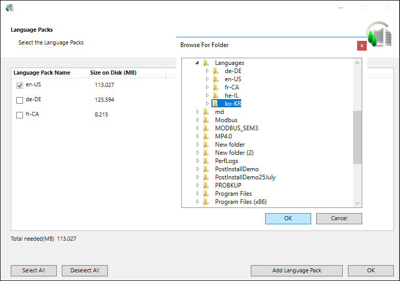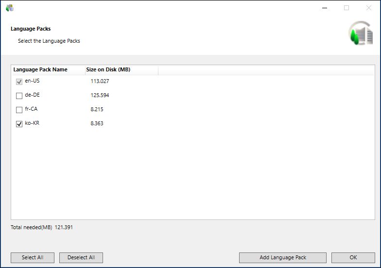 All the language packs contained in the Languages folder get added in the Language Packs dialog box and are selected by default.