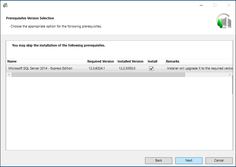 - Click Next until the Prerequisite Version Selection dialog box displays. The Prerequisites Version Selection dialog box lists the required versions of the installed prerequisites and the actions the Installer will take (for example, Uninstall and Install/Upgrade) during the upgrade.