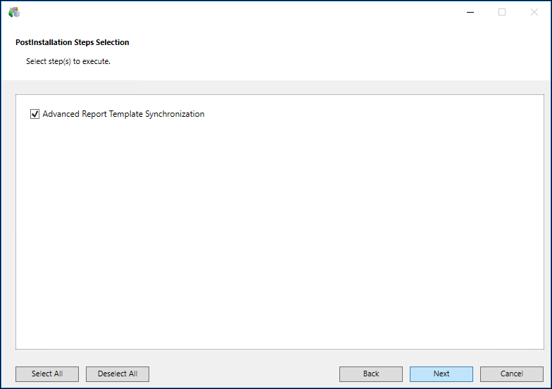 Only the post installation steps having Execute = AskUser for new extensions and InvolvedInUpgradeWorkflow = AskUser for already installed upgradable extensions configured in the [GMS\EMName]PostInstallationConfig.xml file are displayed in the PostInstallation Steps Selection dialog box.