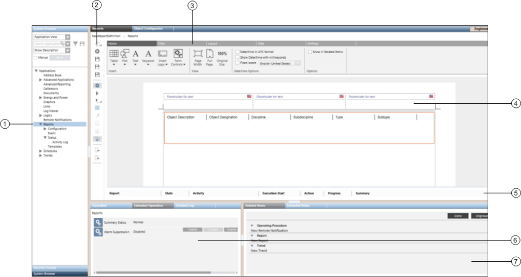 7 | Related Items Tab | Displays the following: New Report: Opens a new Report Definition for configuration. Related Report: Displays the names of the reports related to the selected System Browser object. Show-in-Related Items Report: Displays the name of the reports that has the Show In Related Items check box selected. |