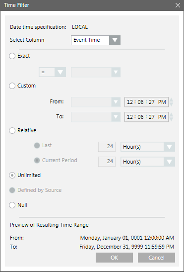 Preview of Resulting Time range | Displays the resulting time range for the options selected in the Time filter dialog box. For example, if the present time is 02/06/2012 4:37 PM, then for the selection current 24 hrs the Preview of Resulting Time Range displays absolute time range for this selection as follows: |