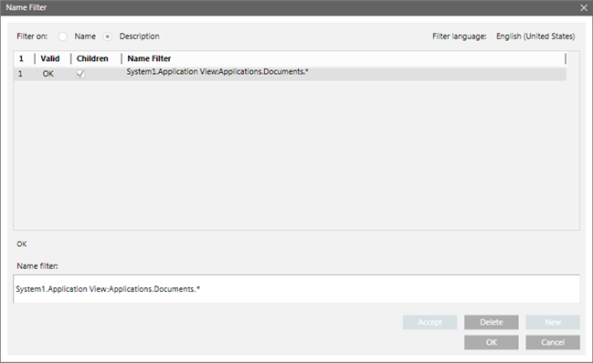 Description | Creates a Name filter according to the object description displayed in the System Browser. A message in red displays below the Name Filter list if the filter is invalid. | |