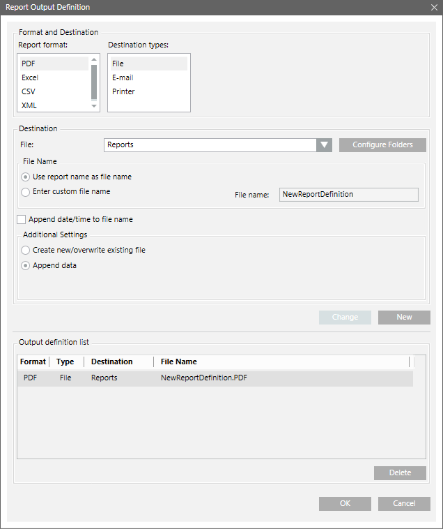 After configuration, you can view and select these output folder paths in the Report Output Definition dialog box.