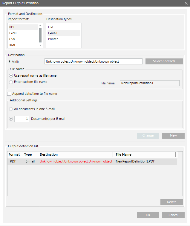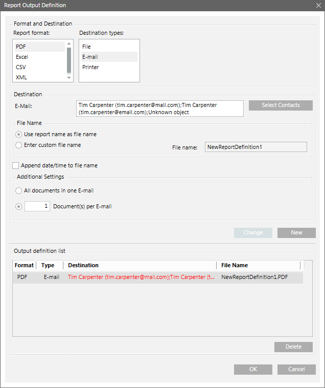 The Output Definition list in the Report Output Definition dialog box and Contacts selection list in the Email Contacts dialog box updates automatically, if you change or delete the email address of a particular recipient in Address Book.