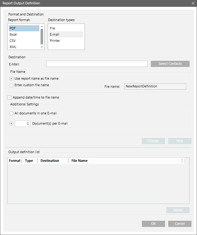 The Report Output Definition dialog box allows you to send a report via email. You can send all documents in one mail or configure the number of documents to be sent per email. The default is one document per email.