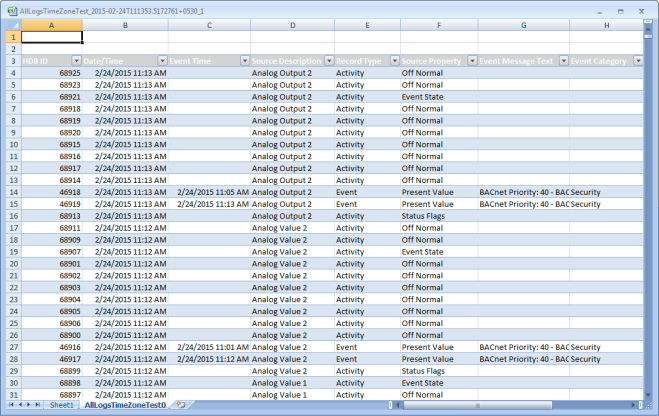 If you have multiple tables or plots in a report definition, the generated Excel document displays the details of each table or plot in a separate worksheet. Each worksheet also displays information on other reporting elements such as keywords and logos in the report definition. Each column in the worksheet has a combo box that corresponds to a table column that enables you to perform analysis on the table data. In case of an Event Details table the generated Excel document does not have any combo boxes as the data displays parent and child records. However, if you remove the child columns from the Select Columns dialog box, run the report, and then generate the Excel document, only the parent records display and the columns display a combo box that enables you to perform data analysis.
