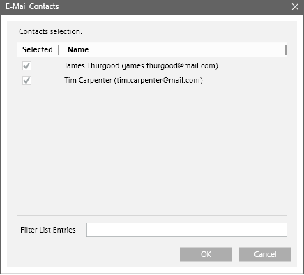 The Email Contacts dialog box displays when you select the destination type as Email and then click the Select Contacts button. This dialog box allows you to choose and filter from the list of all recipients having email addresses configured in the Contacts selection list.