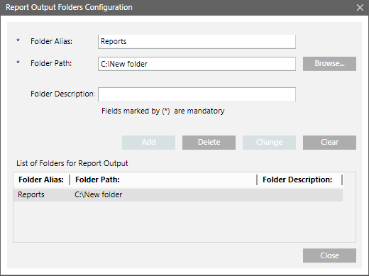 List of Folders for Report Output | Displays list of configured output folders. On selecting a configured output folder, the Folder Alias, Folder Path, and Folder Description fields are populated. |