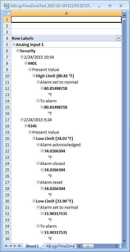 An Excel document contains all of the reporting elements of the Report Definition with output data and user-defined configuration. Form Controls in the report definition are not present in the Excel document. Any special formatting applied to the Report Definition elements are not retained in the Excel document.