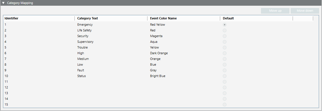 Events that do not match the criteria defined in any of these rows will be assigned to the Default category set in the Category Mapping expander (see above).