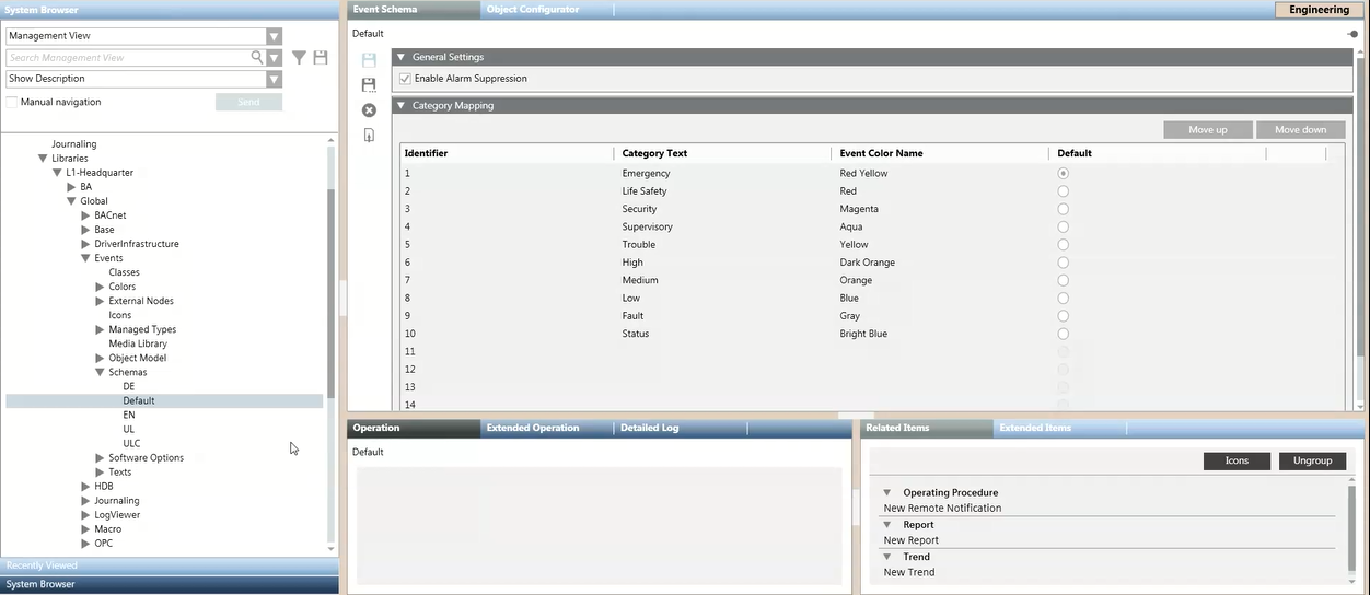 The event schema is a configuration in an Events library that defines how alarms are presented to the user: what event categories are used in a Desigo CC installation, their corresponding category colors, and the mapping of different types of alarms to these categories, and to event sounds.