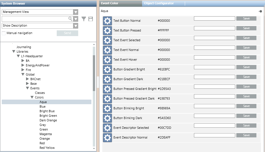 The Colors block of an Events library is used for defining a set of colors that can be used for displaying events. A basic set of colors is provided with the installation, under L1-Headquarter > Global > Events > Colors. For instructions, see Configuring Event Colors in a Library.