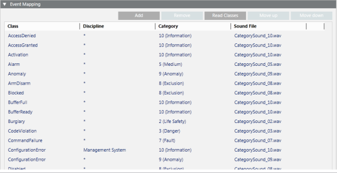 - Category: The category assigned to alarms that match the class and discipline criteria specified in this row. Selected from a drop-down list containing the categories defined in the Category Mapping expander (see above). The available event categories are those defined in the Category Mapping expander.