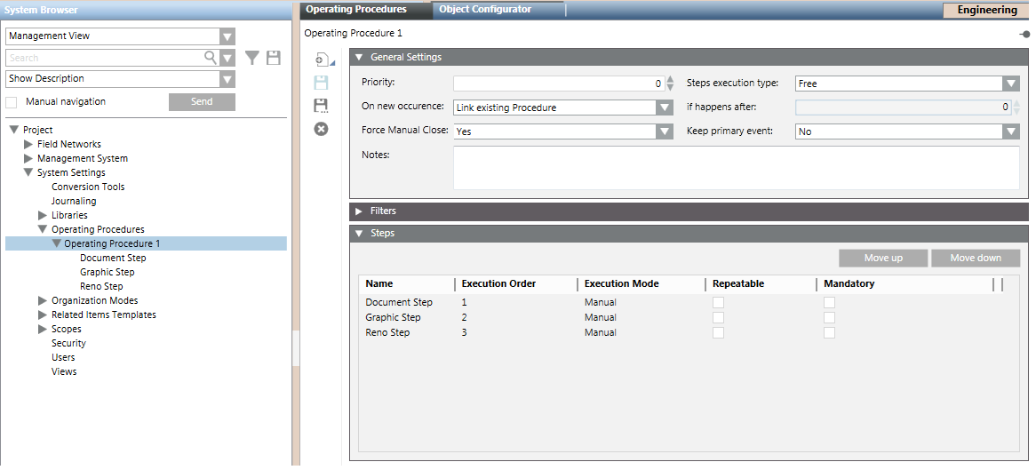 In Engineering mode, when you select an operating procedure in System Browser, a workspace displays where you can configure the settings, filters, and steps for that procedure.