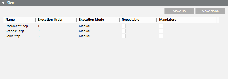 When you configure an operating procedure, the Steps expander displays the list of steps of the currently selected operating procedure and lets you modify some aspects of the steps execution. For more details, see General Settings of a Procedure Step.