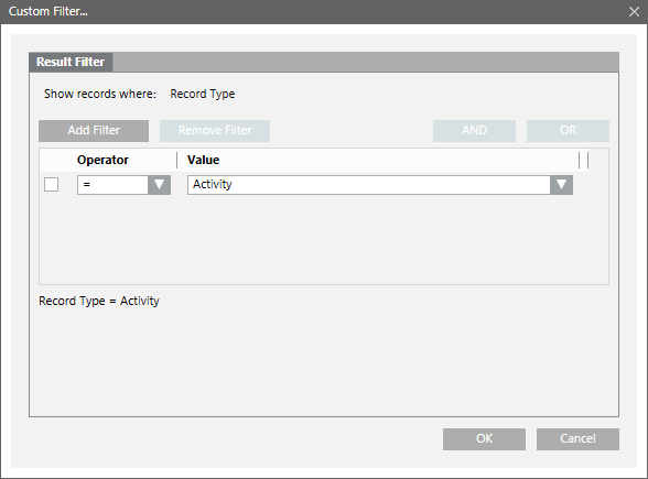 If you apply a result filter on a column with an existing result filter, the new filter condition replaces the older condition.