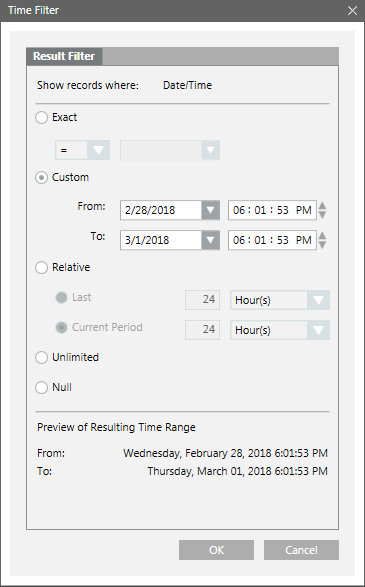 NOTE: By default, the Unlimited option is selected in the Time Filter dialog box. If you want to view records having NULL as the value, select the Null option.