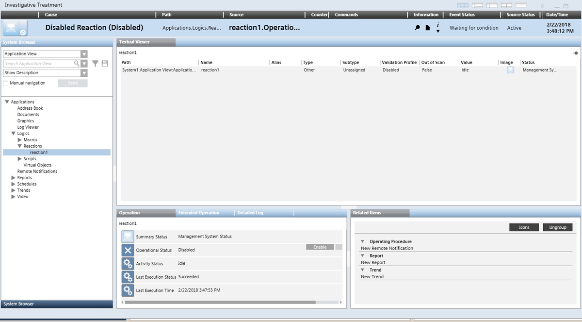 - The Investigative Treatment window opens. This is a window like System Manager, with the event descriptor along the top, and the object that caused the event already selected in System Browser. In Event List, the event button for that event is replaced by a blank placeholder to indicate it is under investigative treatment.