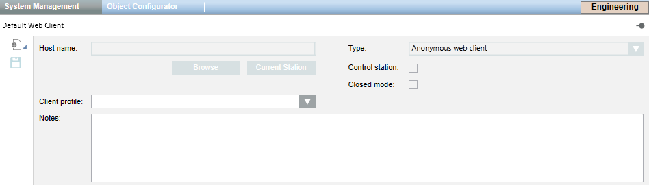 The System Management tab displays. There is no Host name. The Type field is set automatically. The Control station and Closed mode check-boxes are read-only.
