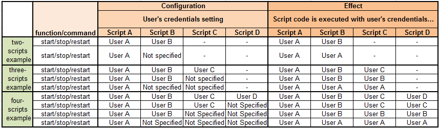 In case of scripts that start, stop, and restart other scripts and are executed with user’s credentials, the invoked scripts are executed with their own credentials only if specifically set. See the following table for reference.