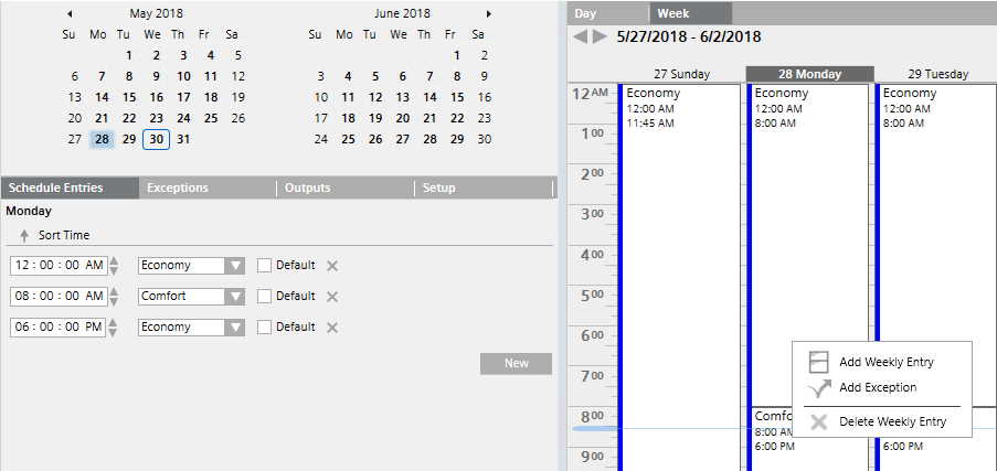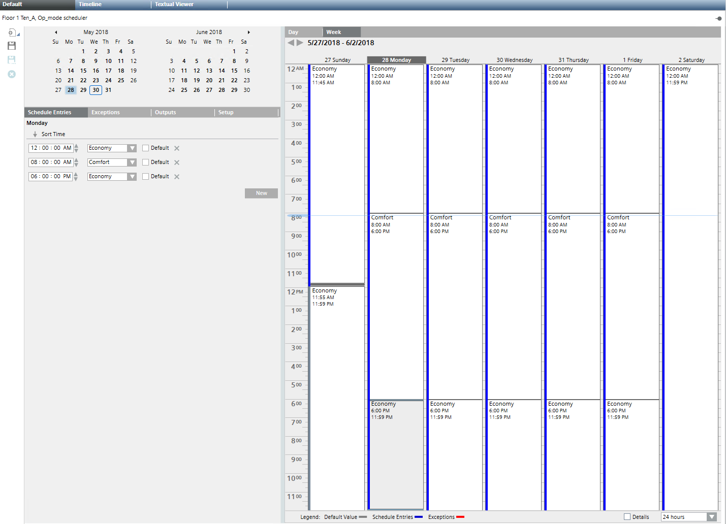 Do the following: a. Select the highlighted row. b. Clear the Default check box. c. In the Exceptions drop-down list, change the entry from Economy to Pre-Comfort. d. For Pre-Comfort operating mode, define the start time (for example, 5.00 AM).