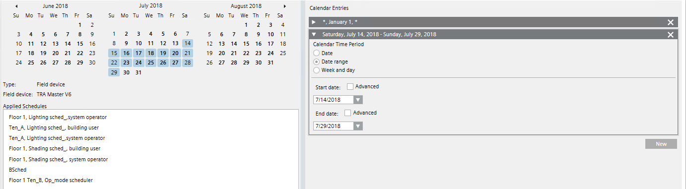 To finalize the scheduler entries, do the following: a. In System Browser, select the scheduler with the assigned calendar. b. Select the Exception tab. c. In the Exception Period expander, select the option Calendar. d. In the Calendar drop-down list, select Calendar 1. e. In the Exception Times expander, check the assigned operating mode (the check box None must be cleared). f. Click Save.