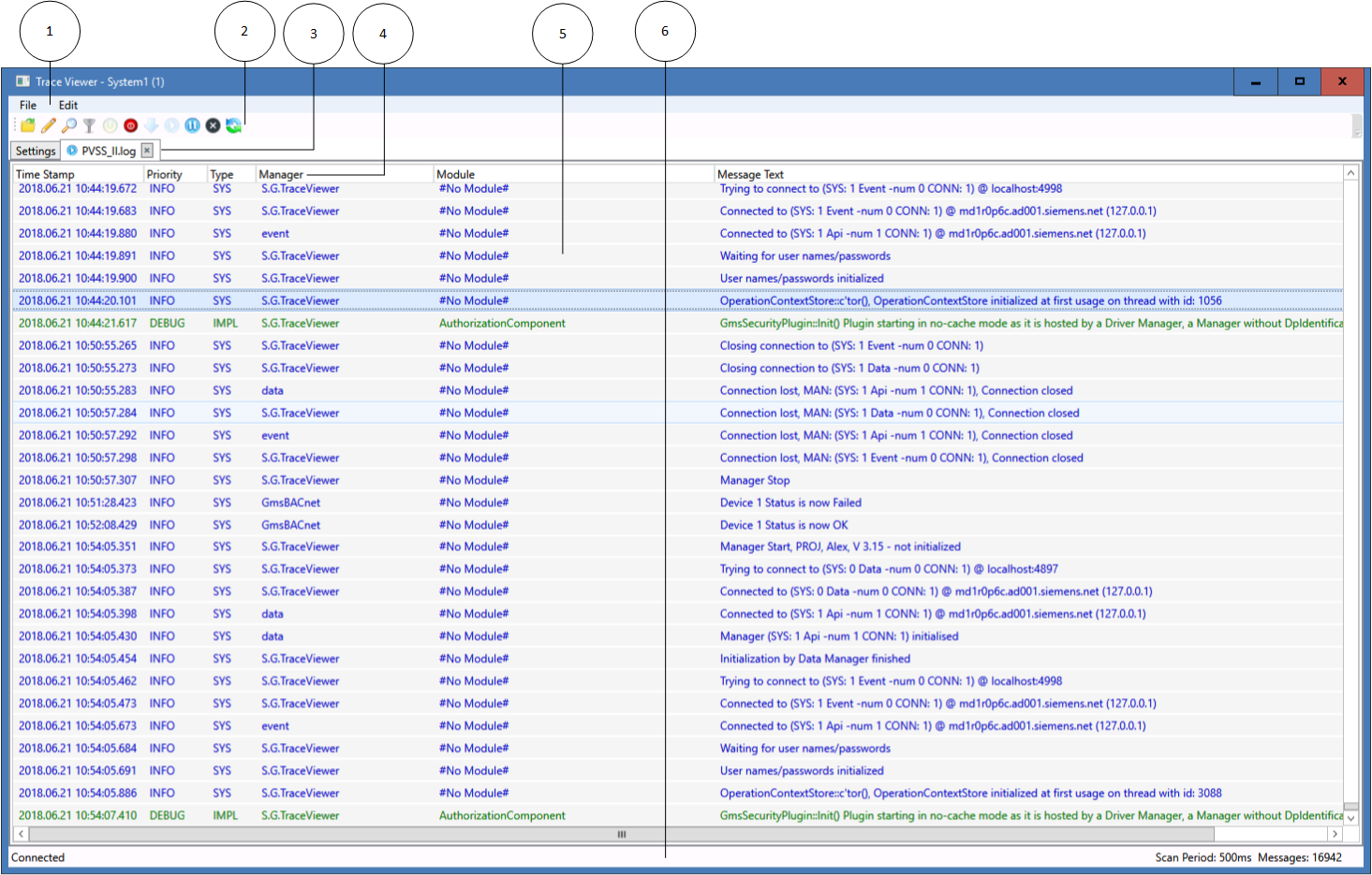 - The Trace Viewer works locally. It shows only the traces generated by Managers running on the same WinCC AO System (and therefore writing to the local PVSSII.log file).The number of instances of Trace Viewer on a single computer is limited to one. However, there can be multiple instances in the same project on several PCs. All these instances share the same GMSTraceFilter data point, and there can be some interaction effects when changing the filter settings or when terminating an instance of Trace Viewer.