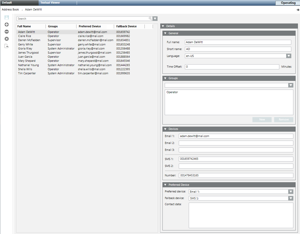 The Desigo CC address book stores a list of contacts (called recipients) which the system can use for sending out remote notifications or for emailing reports.