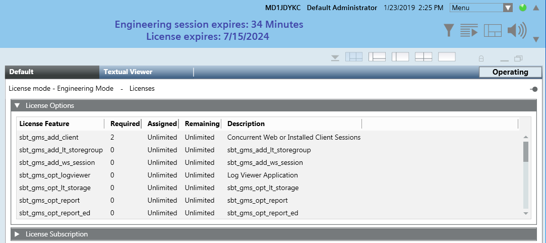 You can double-click on the blue Engineering Session text in the Summary bar to display all the details of the Engineering Mode license. The Assigned and Required columns will show Unlimited for the license features.