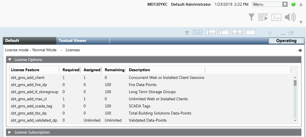 Desigo CC is functioning normally with a valid and sufficient license (sufficient license features to cover the field hardware). In this case, you will not see any special messages on the expanded Summary bar. Only when you select the Licenses object in System Browser you will see that Normal Mode is indicated in the Default tab.