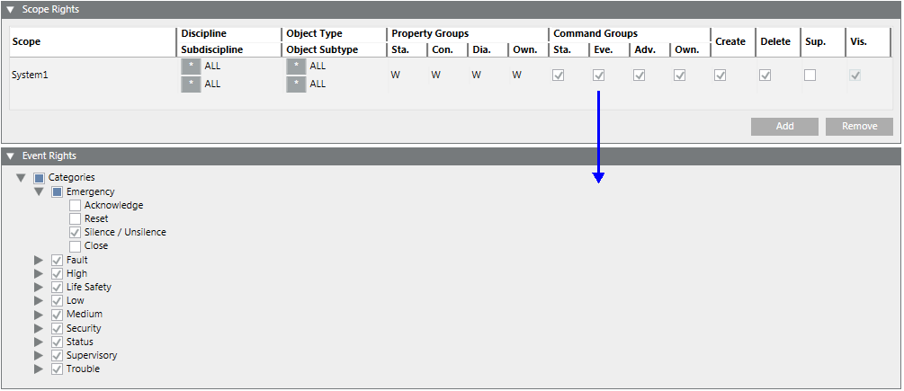 - In the Scope Rights expander, the Event check box in the Command Groups must be enabled to activate the event rights.