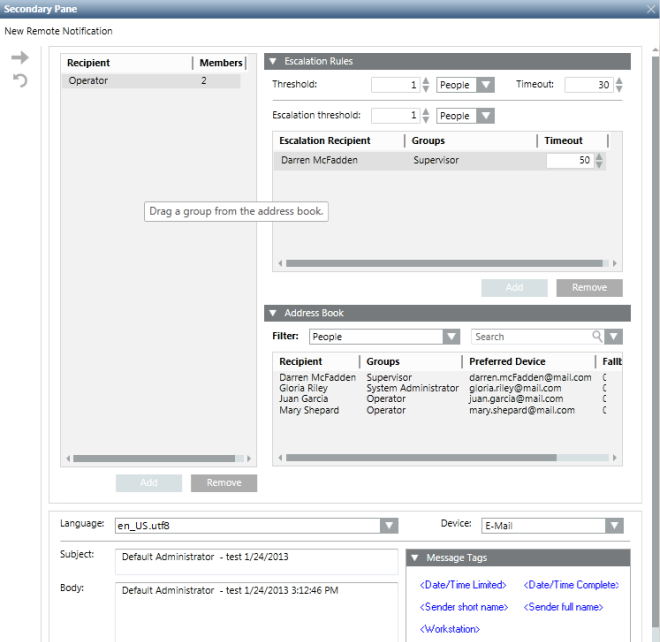 You can open RENO Message in the Secondary pane, and can switch to the New Remote Notification workspace. Here you can compose a message, define the recipients, and send an operator-issued remote notification, that is, one that is not triggered by an alarm.