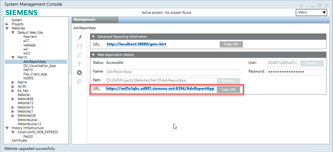 - For working with Advanced Reporting using a Web/Windows App Client on remote computer, you must manually set the MainURL as the Advanced Reporting web application URL (https URL that displays in the Web Application Details expander). For more information, see Configure the Main URL.