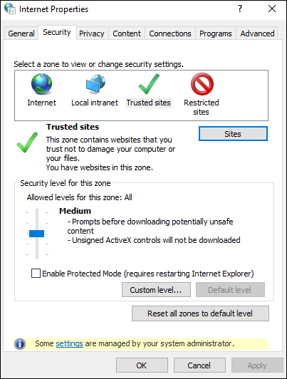 Open Internet Options and add your website / web application URL to Trusted Sites.