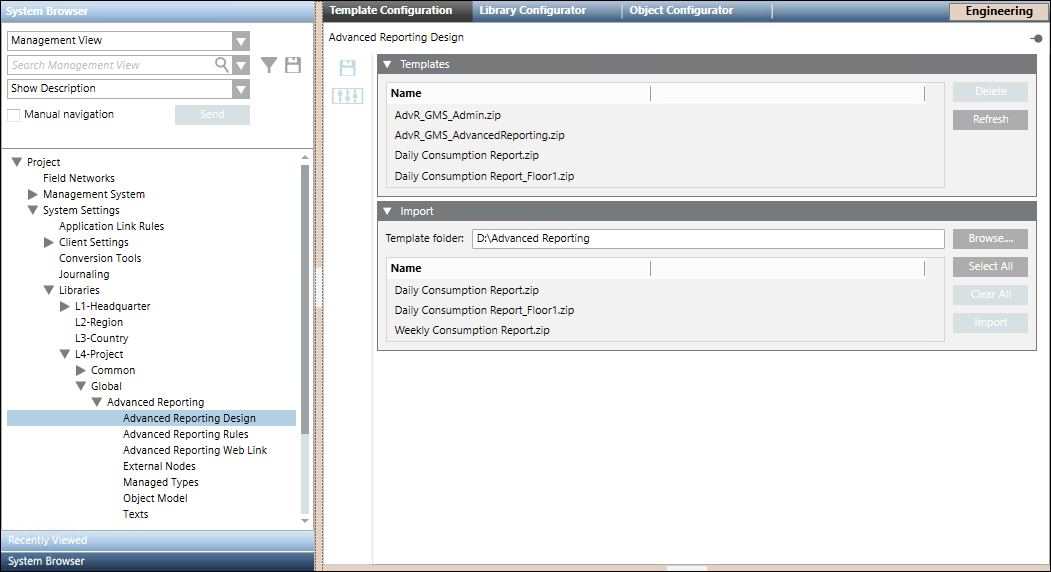 - Import: Imports the selected files and saves them in the Advanced Reporting folder in the selected library in the customer project.