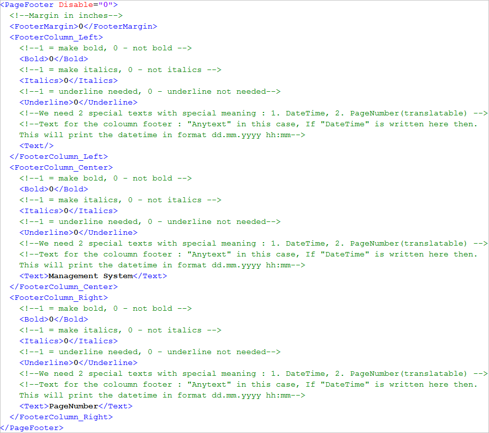 - (Optional) In <PageFooter>, specify Disable = “1” to disable the page footer in the print out, and Disable= “0” to enable the page footer in the print out. The default is Disable = “0”.