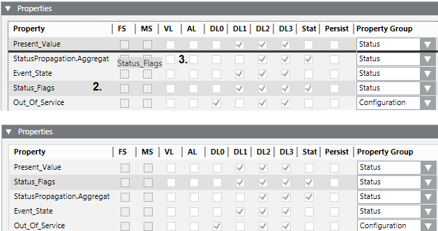 - Logging data values: Select the VL check box if you want to save this property for a change of value.