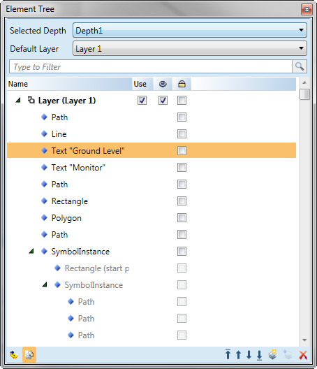 The Element Tree displays all the layers and associated drawing elements of the selected graphic or symbol and also allows you to add or delete layers from the active graphic. Elements within a layer can be ordered using the positioning arrows at the bottom of the view.
