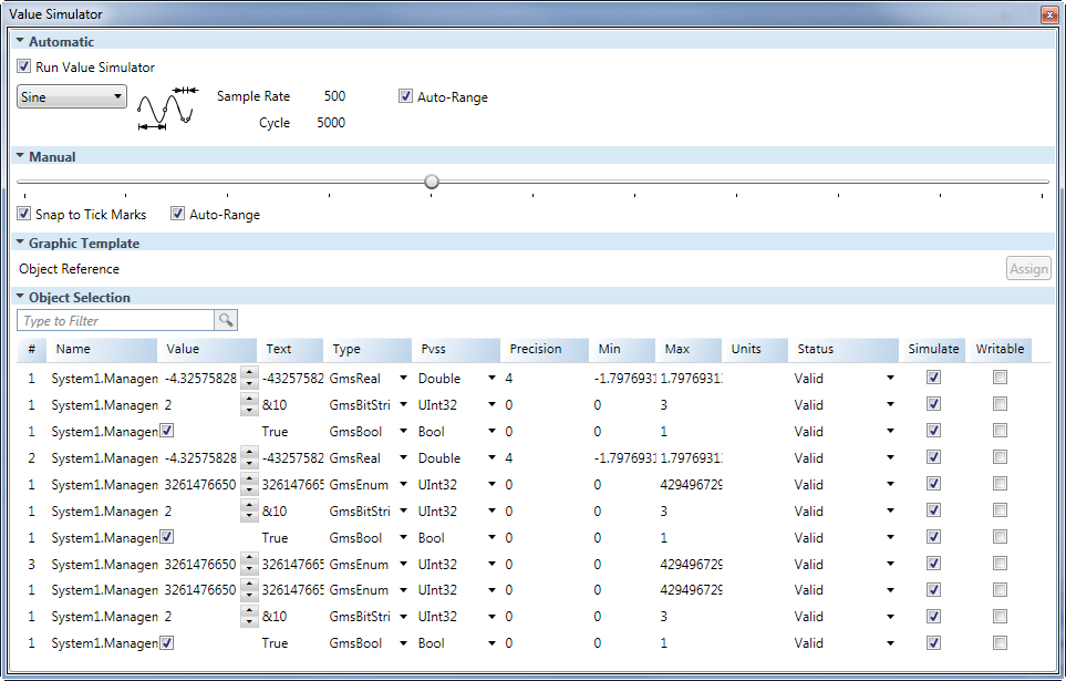 The Value Simulator view allows you to select, view, and adjust the settings for simulating property values to test how graphic settings will be applied. The four sections, Automatic, Manual, Graphic Template, and Object Selection, can be expanded or collapsed.