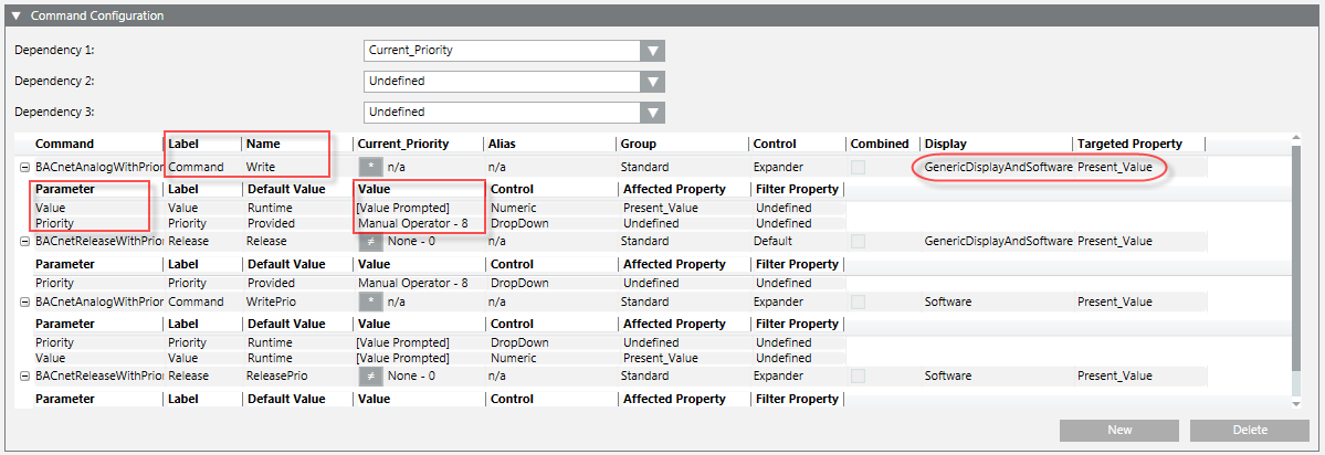 Once you have selected the property, for example, Present_Value, the Command Configuration table displays the command information related to the object type.