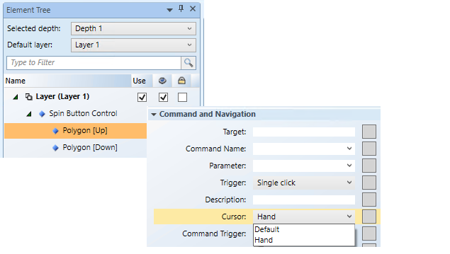 If your command control has a selectable element, for example, the thumb on a slider, and you want the Hand cursor to display instead of the Default cursor when the mouse cursor is over the selectable element, you must configure the cursor on the sub-elements (child) of the command control. This applies to the following command controls: