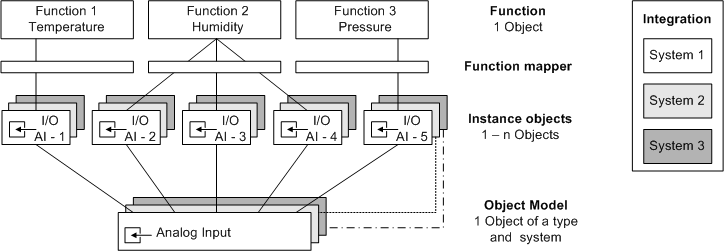 The various names (for example, PrVal = Present_Value) for individual systems to be integrated must be mapped to a Function using a mapper for uniform display of objects based on Function. The number of Object Model properties of the individual subsystems may differ from Function (see the Object Models on System 3 under Examples 2).