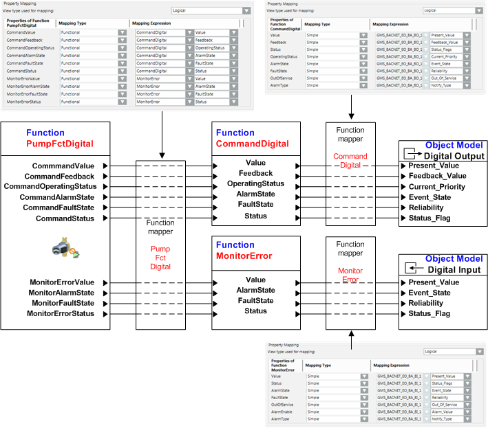 - In the Function Mapper of the PumpFctDigital Function, assign the properties of the CommandDigital and MonitorError Functions.