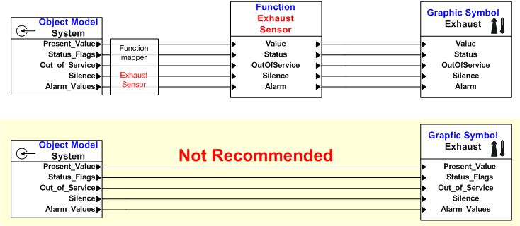Desigo CC permits assigning an instantiated object directly to an Object Model. You should, however, continue to use Function from an operational viewpoint relating to maintaining the value of a system. When replacing or extending a plant, the new system can easily be mapped to the corresponding Function without having to create new mappings. Furthermore, the old and new system can be operated using the same philosophy.