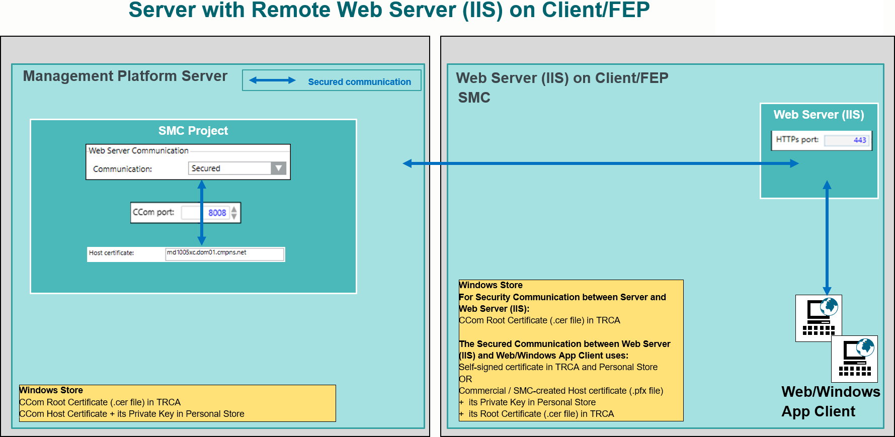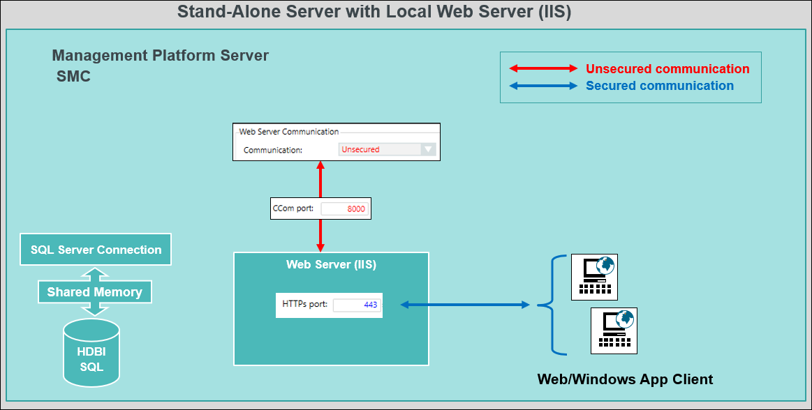 The communication between the Desigo CC Server and the local web server (IIS) can be left unsecured (without certificates) as they both are hosted on the same stand-alone computer. The communication between the web server (IIS) and Web/Windows App clients is always secured (using the web application certificate).
