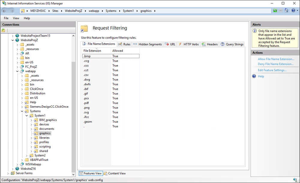 The allowed file types for each virtual directory mentioned in the web.config file are also configured in IIS using the Request Filtering feature, thus ensuring file transfer only for the specified file types. Note that no request filtering is configured for the shared and documents virtual directories as these are read-only directories. To view the allowed file types for a virtual directory in IIS, do the following: