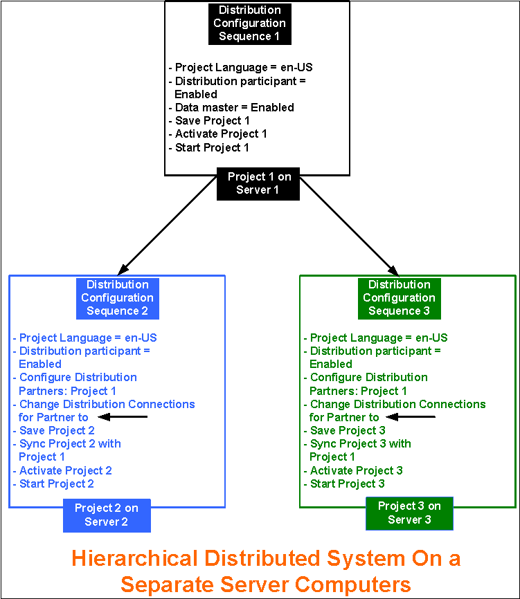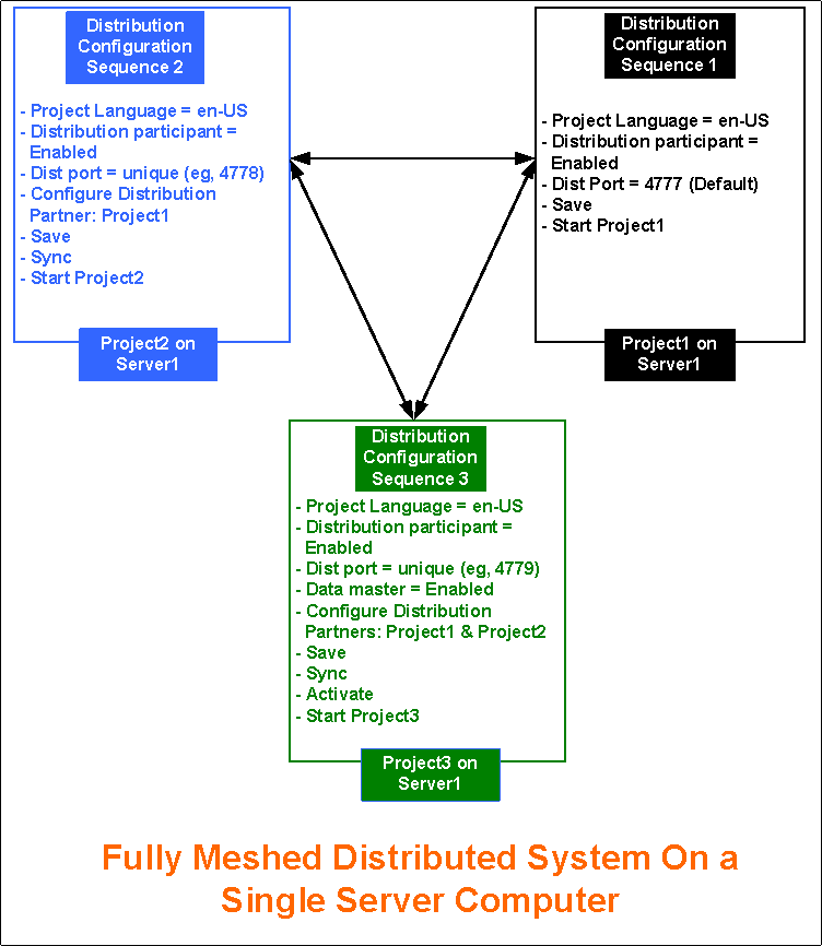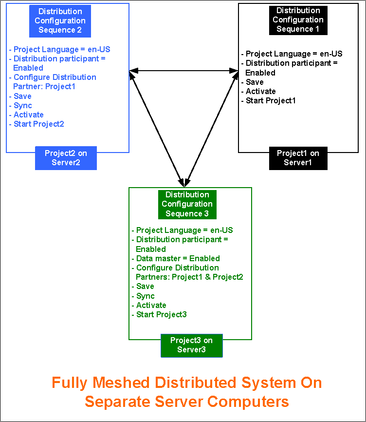 You want to set up a Fully Meshed distributed system on separate servers. To do this, you must configure the projects on separate servers in distribution.
