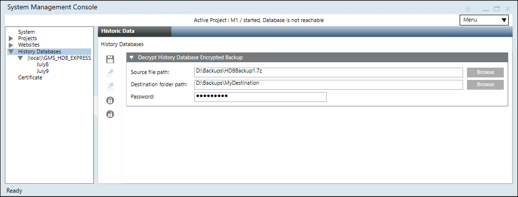 - The selected compressed, encrypted history database backup is decrypted and is stored at the specified destination folder.